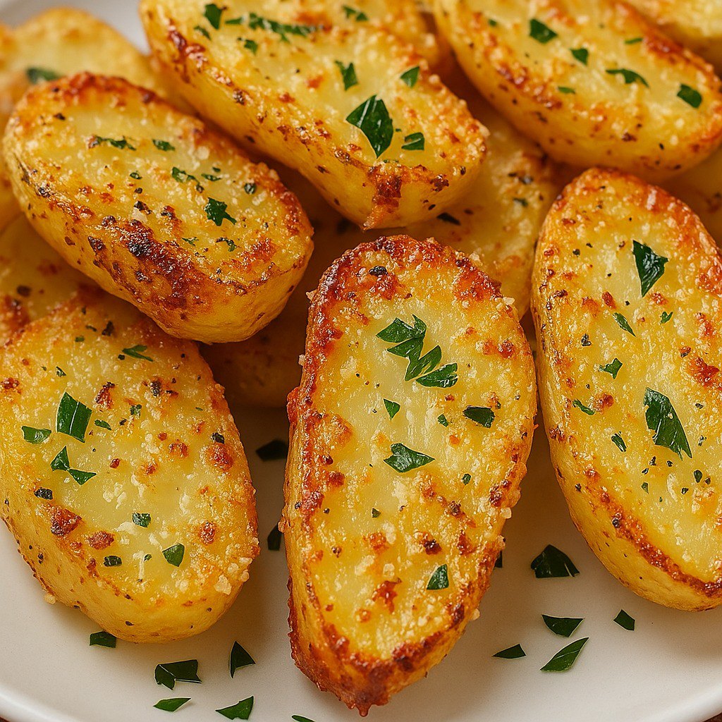 In a large mixing bowl, combine the halved potatoes, olive oil, garlic, thyme, smoked paprika, salt, and pepper. Toss until evenly coated. - Add the Parmesan