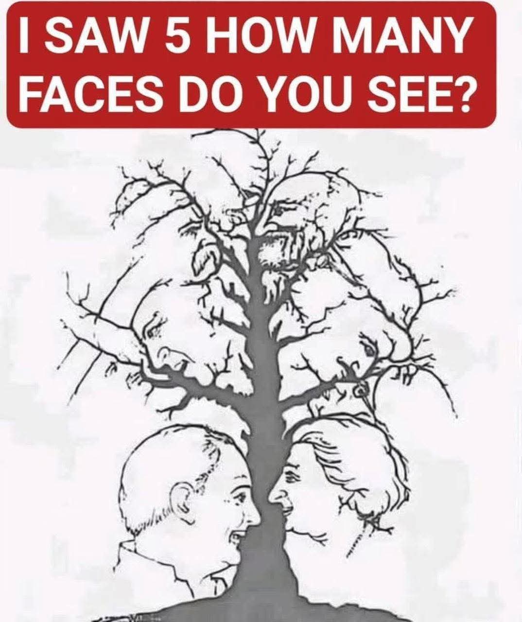 previously mentioned, the two faces at the bottom of the tree are there for all to see. If, however, you can only spot one or two additional faces, it may indicate that you have a memory disorder.