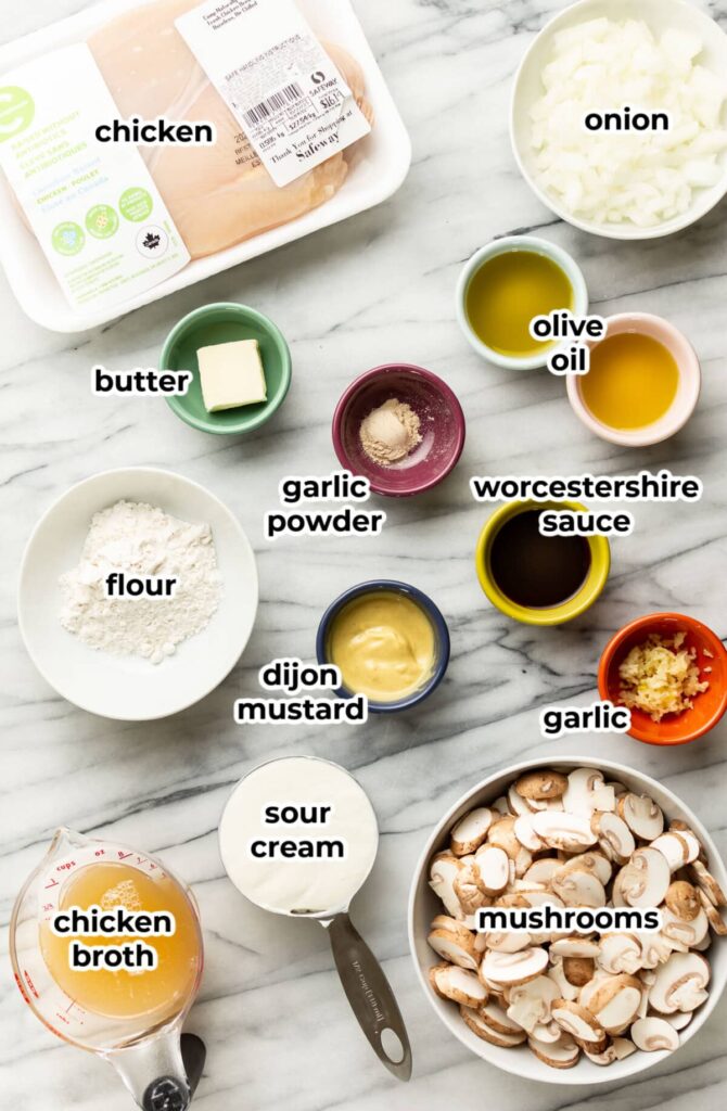 Sauté until the water is released, cooked off, and everything is nicely browned (don’t rush this step!). Stir in the Dijon, Worcestershire, and garlic. After a minute, stir in the broth and scrape up the browned bits. Return the chicken. Stir in the sour cream, heat through, and season with salt & pepper as needed.