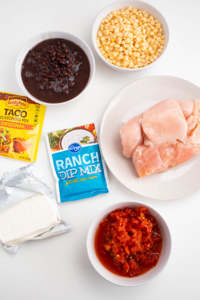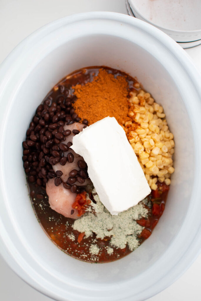 Place 2 chicken breasts, thawed and trimmed of fat on the bottom of a Crock Pot and cover with 1 ounce of taco seasoning, 1 ounce of ranch seasoning mix, 15 ounces of canned black beans, 15 ounces of canned corn, 10 ounces of Rotel tomatoes with green chiles, and 8 ounces of cream cheese. Make sure the cream cheese goes on the very top.