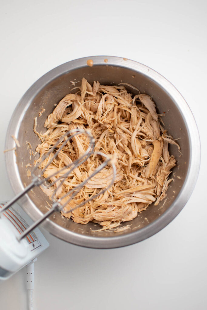 I usually shred the chicken breasts with two forks, but if you’d like it to go faster you can put the chicken in a bowl and use an electric beater.